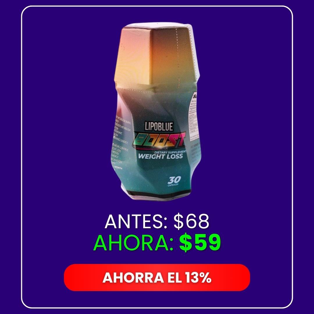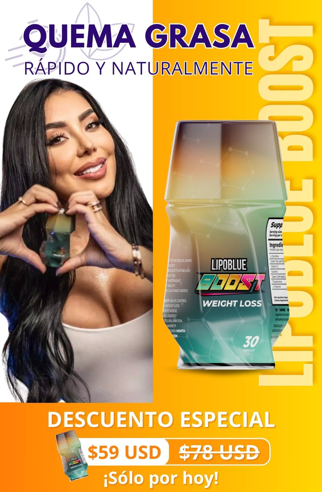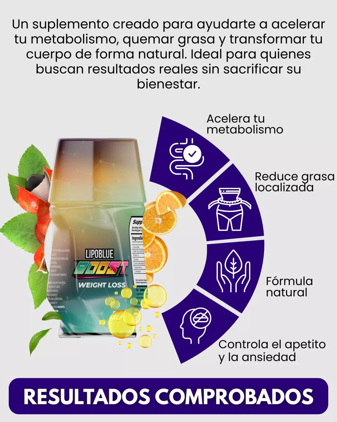 LIPOBLUE BOOST es un suplemento natural en cápsulas diseñado para acelerar tu metabolismo, reducir grasa localizada, controlar el apetito y ayudarte a lograr una transformación corporal segura y efectiva.