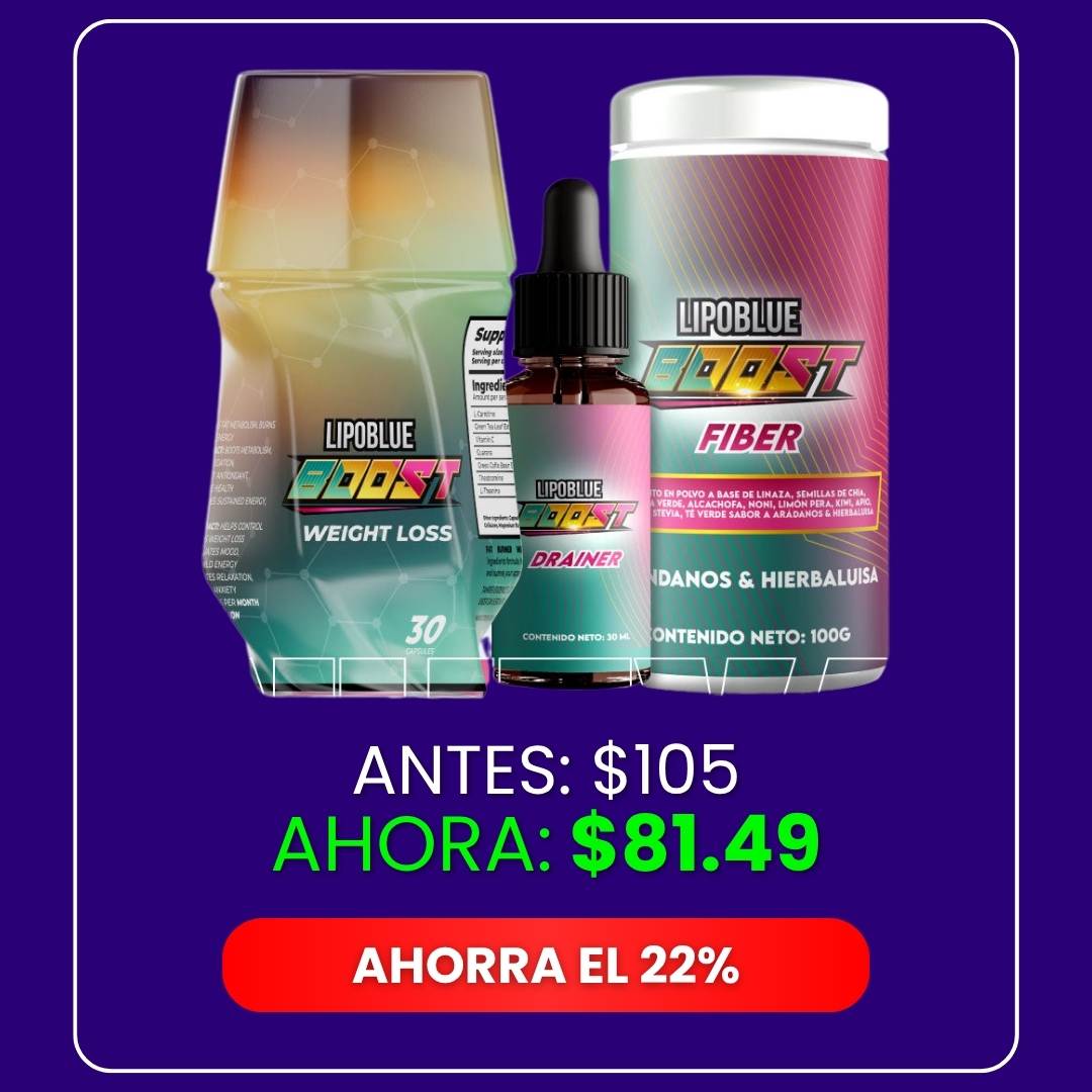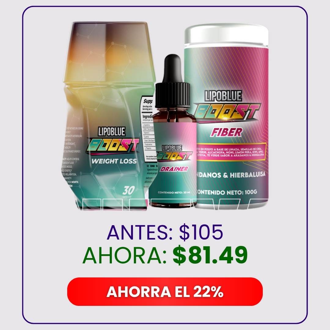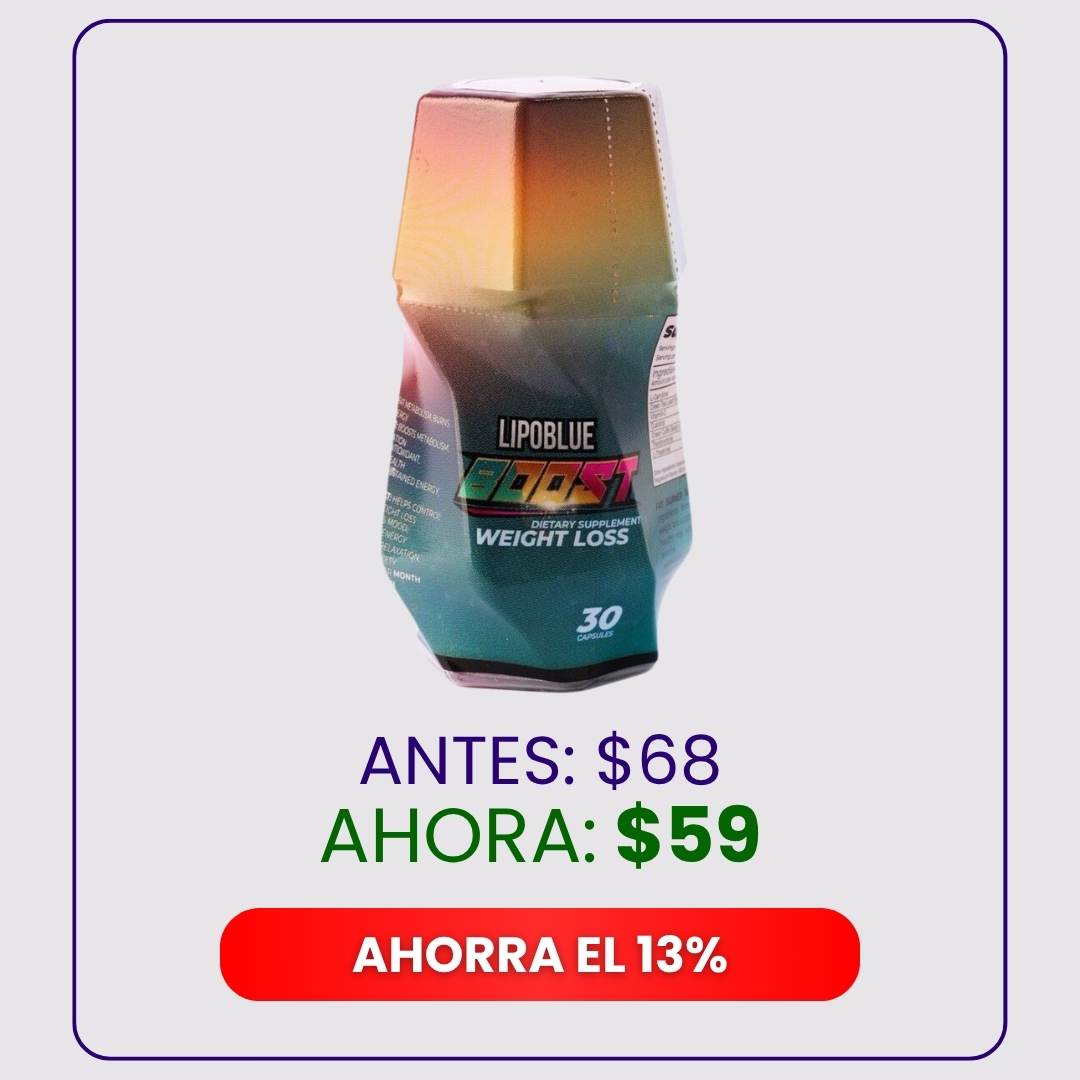 LIPOBLUE BOOST es un suplemento natural en cápsulas diseñado para acelerar tu metabolismo, reducir grasa localizada, controlar el apetito y ayudarte a lograr una transformación corporal segura y efectiva.