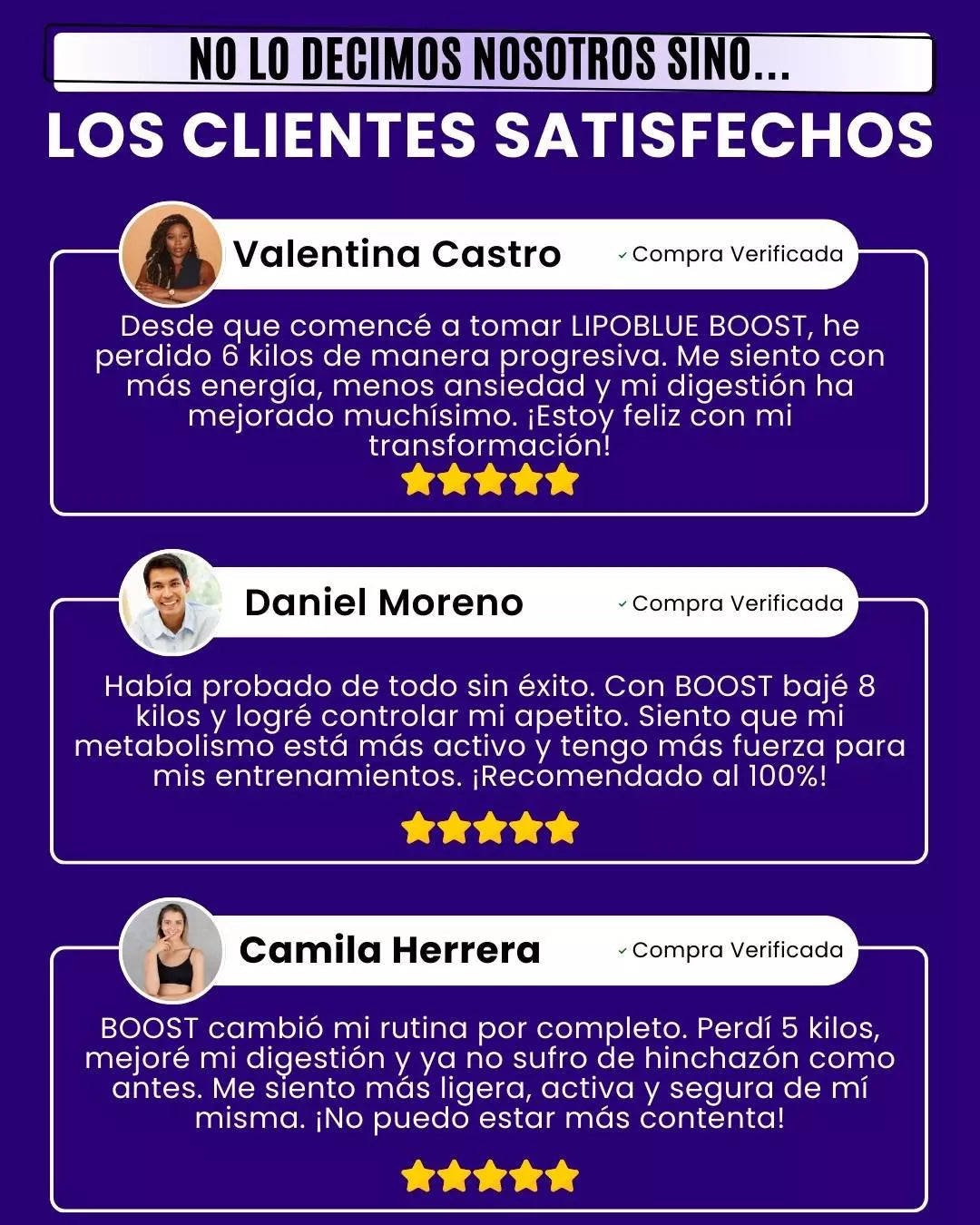 LIPOBLUE BOOST superó mis expectativas. Me ayudó a controlar la ansiedad por la comida y a tener más energía durante el día. Me siento más ligero, activo y con mejor ánimo para entrenar.